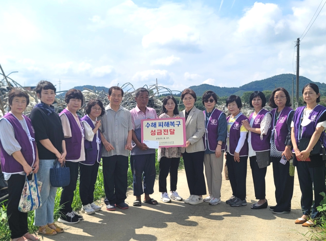 특별히 8월 31일에는 최영선 한국회장을 비롯하여 회원 8명이 수해피해를 크게 입은 충청남도 부여군을 방문하여 구호 성금을 직접 전달했습니다. 전달식에서 최영선 한국회장은 수박농가와 버섯재배 농가 주민을 만나 위로와 격려의 인사를 전했으며, 지역 주민들은 “수해피해로 어려움을 겪고 있던 와중에 여성연합에서 보내 주신 관심과 사랑이 큰 도움이 될 것”이라며 감사의 인사를 전했습니다.