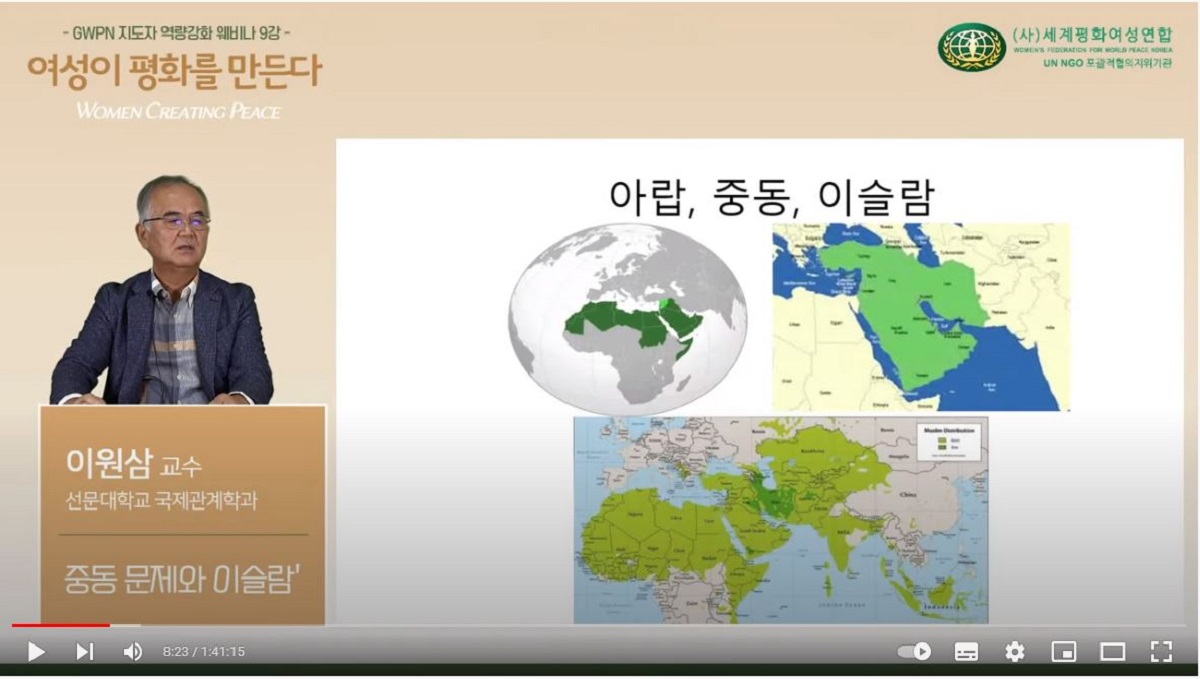 10월 12일 Global Women’s Peace Network 지도자역량강화 웨비나 ‘여성이 평화를 만든다’ 9강이 오전 10시 유튜브 생중계를 통해 개최되었다. 금번 웨비나는 ‘중동 문제와 이슬람’이라는 주제로 이원삼 교수(선문대학교 국제관계학과)의 초청 강의를 진행하였다.