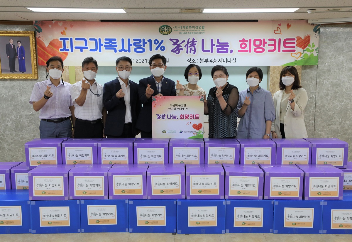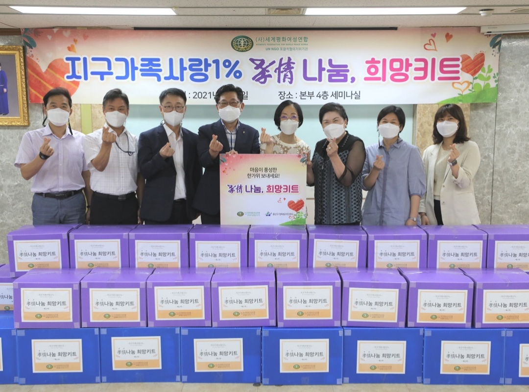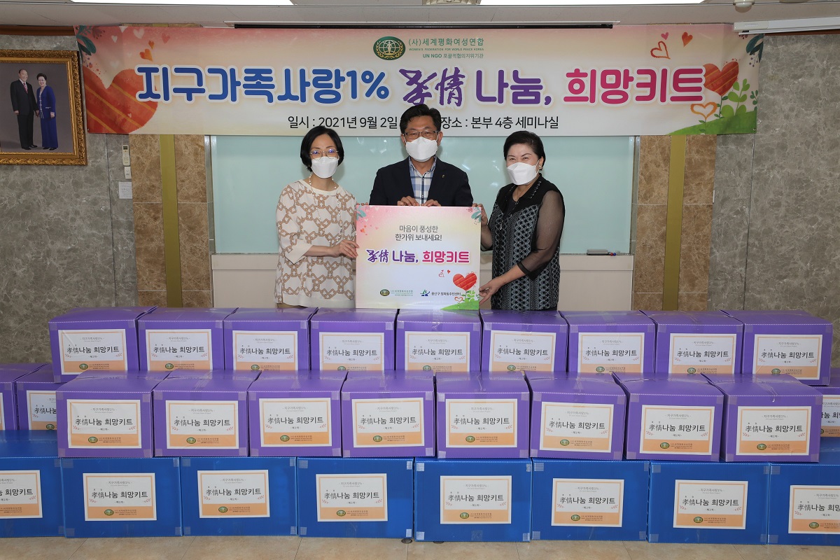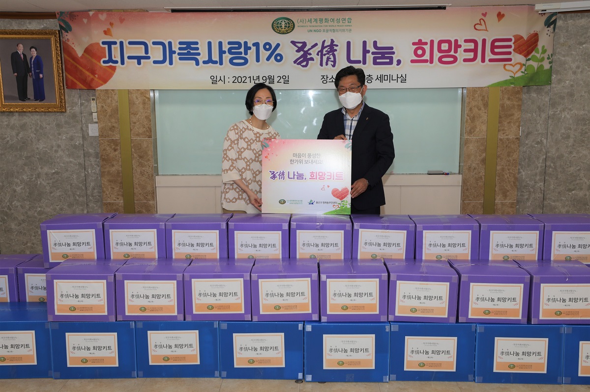 세계평화여성연합(이하 여성연합)은 다가오는 추석 명절을 맞이하여 본 연합이 속해있는 청파동 지역의 소외계층을 위해 5만 원 상당의 생필품이 담겨있는 희망키트 50박스를 청파동 주민센터(정윤권 동장)를 통해 전달하였다.