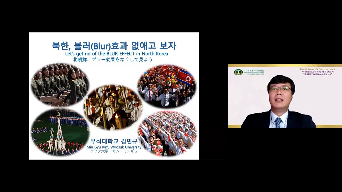 김민규 교수는 한국 언론에 보도된 북한의 허위사실과 북한 사람들의 사고방식 형성과정을 자세히 설명하며, “현재 남북한은 서로 다른 가치관과 정체성으로 인해 초보적인 이해도 못 하고 있습니다. 서로 다른 가치관과 정체성을 합쳐가는 것이 곧 통일입니다. 통일을 위해, 세계평화를 위해 남북을 잇는 교량 역할에서 세계평화여성연합이 앞장서주실 것을 이 자리를 빌어 정중히 부탁드립니다.”고 당부하였다.