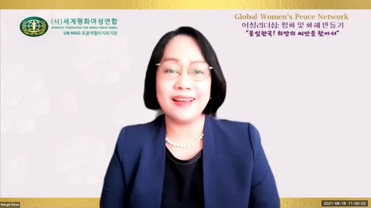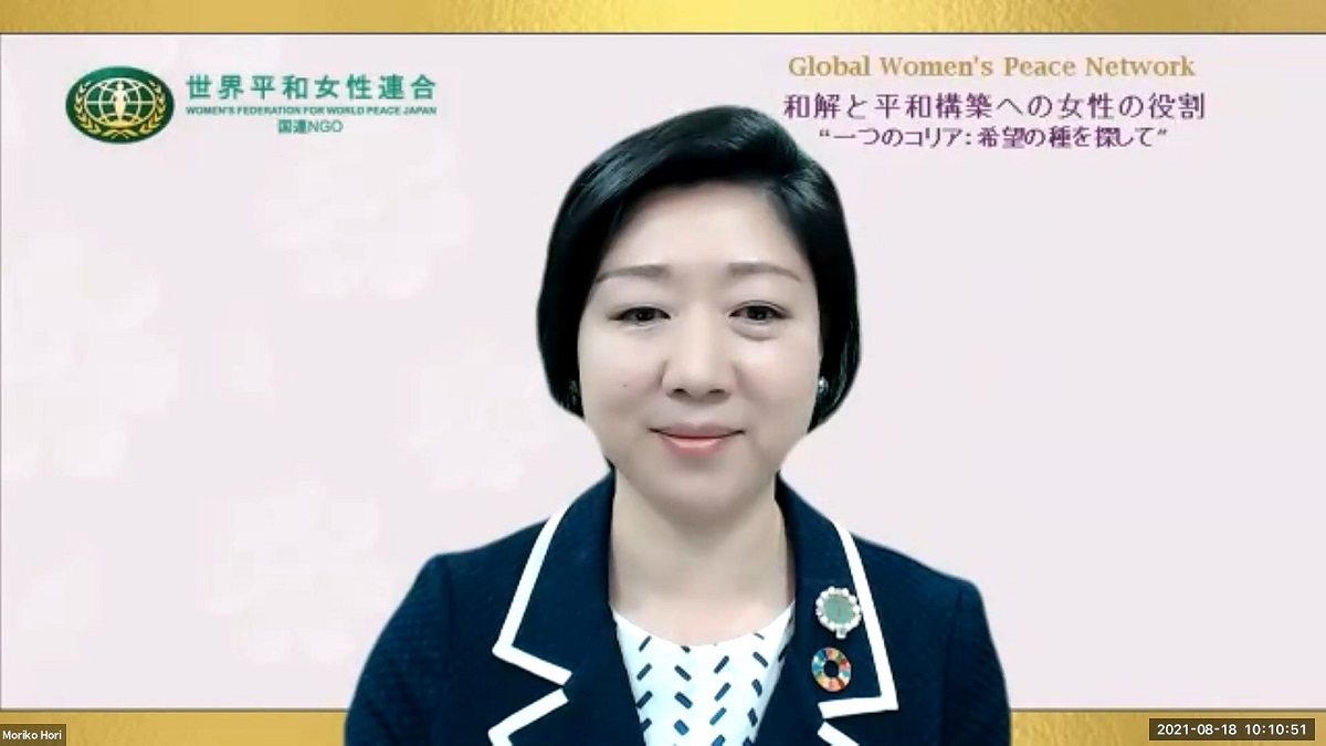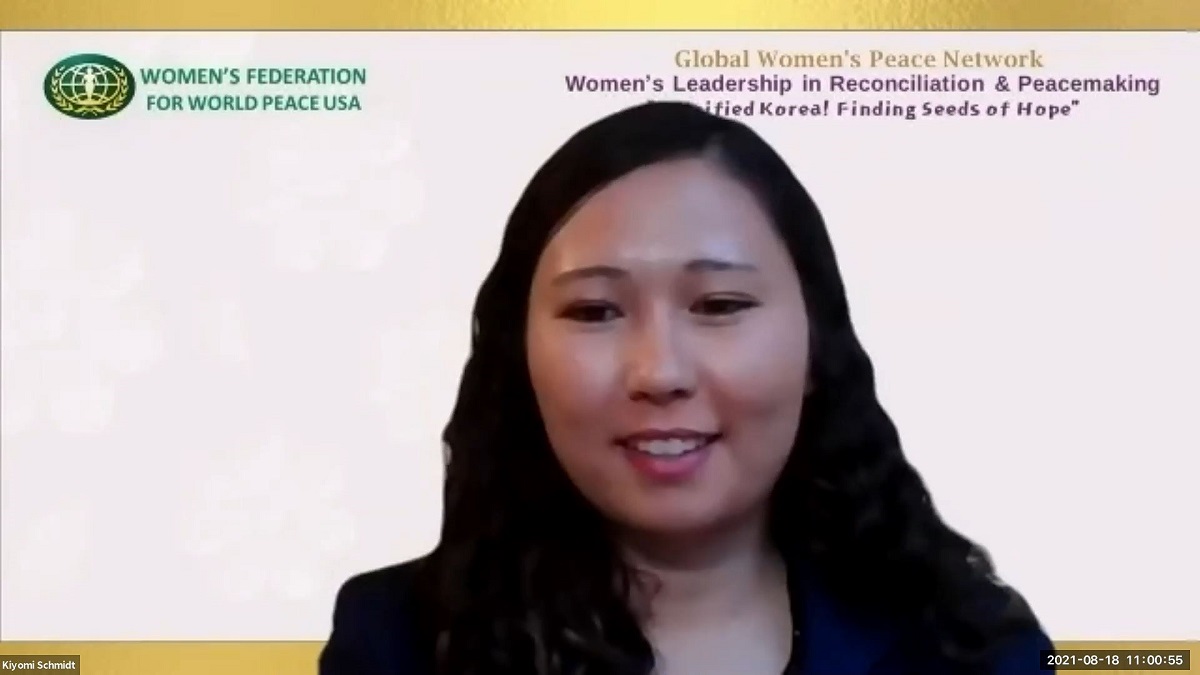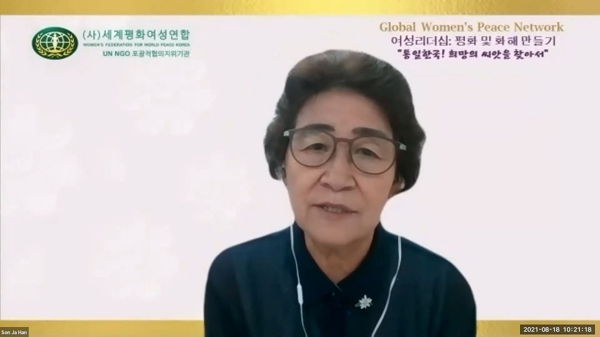 8월 18일 오전 9시 30분에 ‘여성 리더십 화해 및 평화 만들기’ 한·미·일 GWPN 웨비나가 전 세계의 여성지도자 690여명이 참석한 가운데 온라인으로 개최되었다. 금번 웨비나는 ‘통일한국: 희망의 씨앗을 찾아서’라는 부주제를 가지고 세계평화여성연합 한국, 일본, 미국의 공동주최로 진행되었다. 행사는 호리 모리꼬 회장(여성연합 일본)의 사회로 시작되어, 문훈숙 세계회장의 환영사, Angelika Selle 회장(여성연합 미국)의 GWPN 소개, 김민규 교수(우석대학교)의 발제, 전희량씨의 일본 사례보고, 한선자 실장(북한인권국제연대)의 한국 사례보고, Rosa Park 국장(북한인권위원회)의 발제, 문혜림 회장(여성연합 한국 경기·강원권)의 폐회사, Kiyomi Schmidt 사무총장(여성연합 미국)의 구호사업 소개, 리틀엔젤스예술단의 문화공영 영상시청의 순으로 진행되었다.