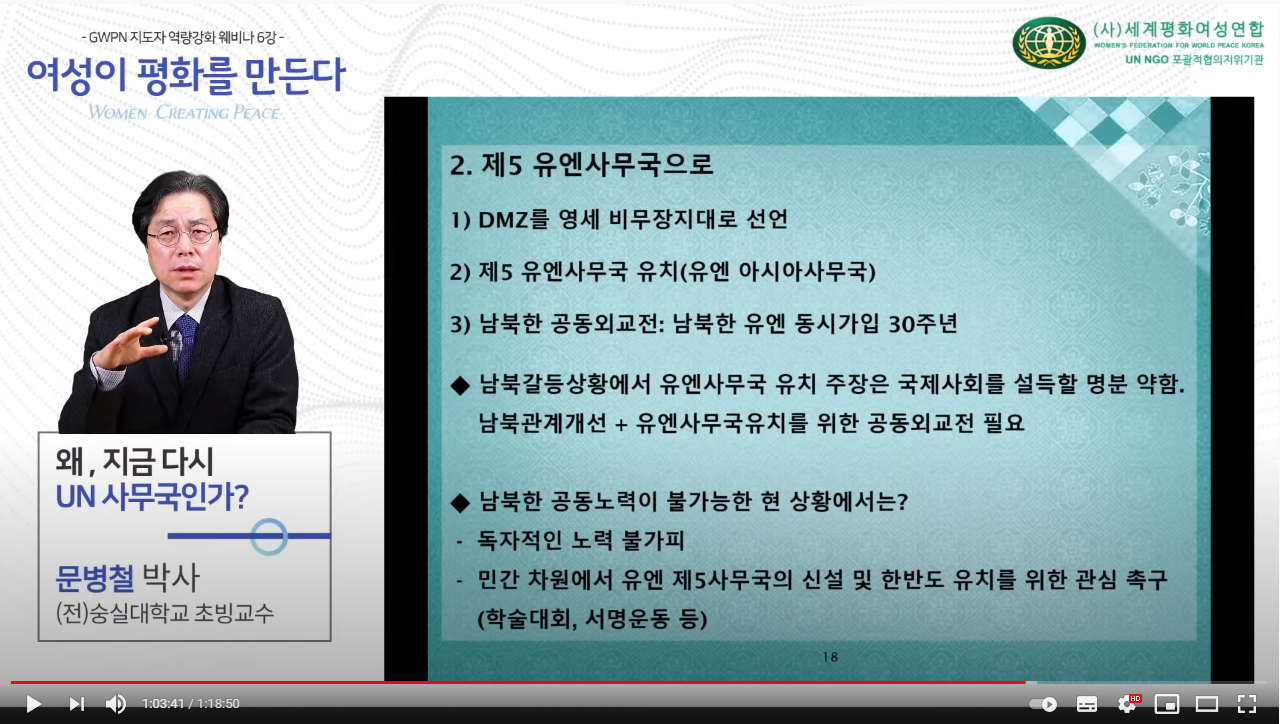 3월 9일 Global Women’s Peace Network 지도자역량강화 웨비나 ‘여성이 평화를 만든다’ 6강이 오전 9시 30분 유튜브 생중계를 통해 개최되었다. 금번 웨비나는 ‘왜 지금 다시 UN 사무국인가?’라는 주제로 문병철 박사(숭실대학교)가 강의를 진행하였다.
