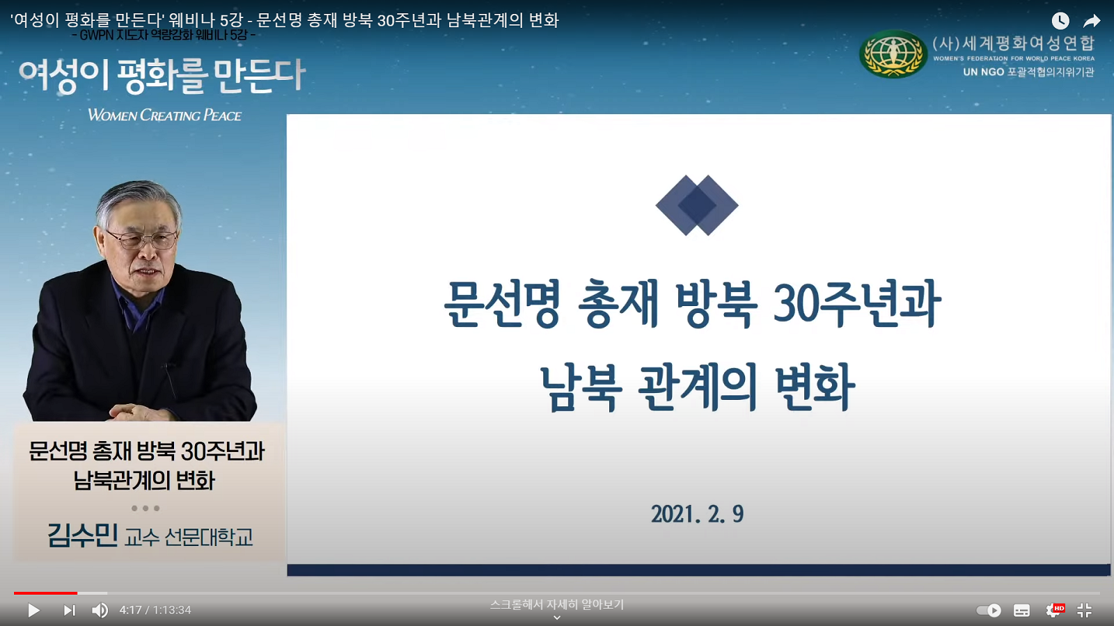 2월 9일 Global Women’s Peace Network(이하 GWPN) 지도자역량강화 웨비나 ‘여성이 평화를 만든다’ 5강이 오전 9시 30분 유튜브 생중계를 통해 개최되었다. 금번 웨비나는 ‘문선명 총재 방북 30주년과 남북관계의 변화’라는 주제로 김수민 교수(선문대학교)가 강의를 진행하였다.