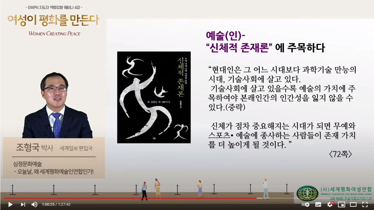 1월 19일 Global Women’s Peace Network(이하 GWPN) 지도자역량강화 웨비나 ‘여성이 평화를 만든다’ 4강이 오전 9시 30분 유튜브 생중계를 통해 개최되었다. 금번 웨비나는 ‘심정문화예술 – 오늘날, 왜 세계평화예술인연합인가!’라는 주제로 조형국 박사(세계일보 편집국)가 강의를 진행하였다.