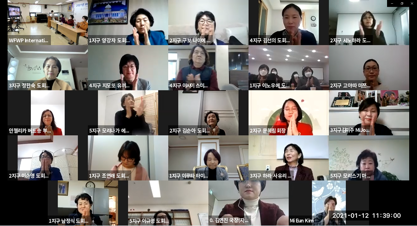 세계평화여성연합(이하 여성연합) 한국본부에서 주최하는 2021년도 WFWP 신년하례회가 지난 1월 12일 오전 9시 30분부터 12시까지 줌 웨비나를 통해 개최되었다. 유정화 사무총장의 사회로 시작된 금번 행사는 개회, 우리의 다짐, 신년하례 – 케익커팅, 건배제의, 문훈숙 세계회장과 김수연 한국회장의 신년인사, 권역별 활동계획 보고, 본부 활동계획 보고, 폐회 순으로 진행되었으며, 전국의 여성 지도자 300명이 참여하였다.