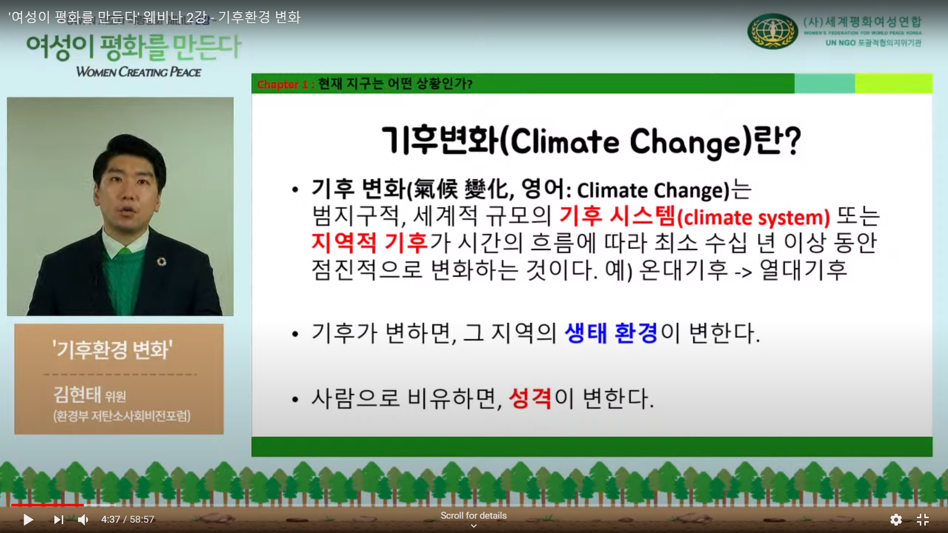 11월 4일 Global Women’s Peace Network(이하 GWPN) 지도자역량강화 웨비나 ‘여성이 평화를 만든다’ 2강이 오전 9시 30분 유튜브 생중계를 통해 개최되었다. 웨비나는 ‘기후환경 변화’라는 주제로 김현태 위원이 강의를 하였다.