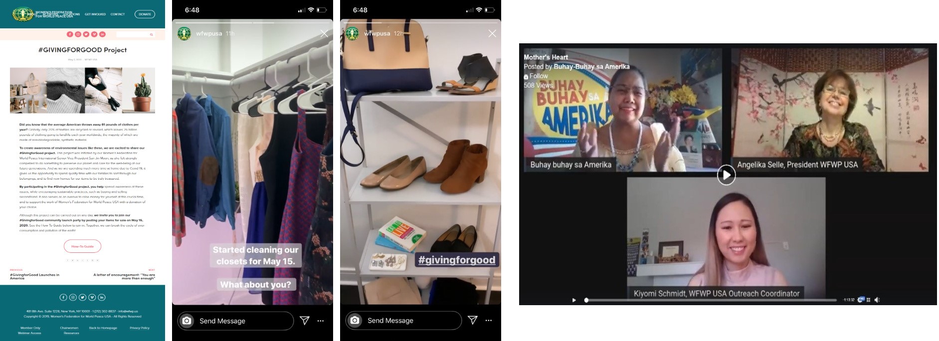 ‘Giving for Good’프로젝트는 문선진 세계수석부회장(여성연합)의 제안으로 시작한 프로젝트입니다. 특히, 미국 여성연합이 올해 5월 15일부터 공식적으로 웹사이트를 통해 시작하여, 회원들뿐만 아니라 많은 사람한테 좋은 평가를 받고 있습니다. 본 프로젝트는 환경문제에 대한 인식을 높이면서, 개개인이 소유하는 의류나 기타 물품 중 사용 안 하는 물품을 중고거래사이트를 통한 판매 또는 직거래를 하면서 나오는 수익금의 일부를 여성연합의 인도주의적 활동 또는 코로나19 지원금으로 후원하는 프로젝트입니다.