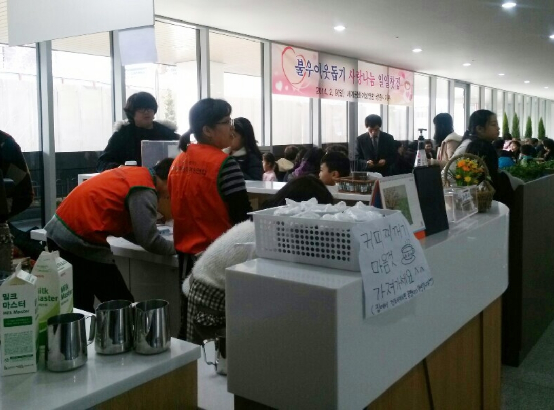The deputy branch leader and ten members of the Changwon Branch (Branch Leader: Namie Kubo) hosted a ‘One-day Café to Aid our Neighbors in Need’ at the ground floor coffee shop and lobby of the Changwon Branch building on February 9. At the event, coffee and various kinds of tea were sold from 12:30 pm to 3:00 pm, and the proceeds of the day were presented to the families of two members who are in difficult circumstances. In addition, nine members provided a soup kitchen service on February 27 at the Banji Welfare Center.