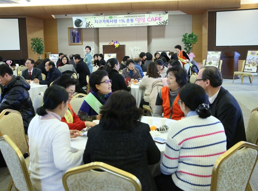 여성연합 중앙위원(회장:박미화) 주최로 ’지구가족사랑1%운동’ 일일카페를 2013년 12월 11일, 협회 8층 대강당에서 열었다. 중앙위원들은 1기부터 7기까지의 수료생들이 함께 동참한 가운데 5회째 열리고 있는 일일카페를 통해 매년 12월 한 해를 감사의 마음으로 정리하며 지인들을 초대해 준비한 차와 다과를 즐기는 시간으로 진행되고 있다. 또한 이날 열린 일일카페의 통한 수익금은 ‘지구가족사랑1%운동’에 후원되기도 하였다.