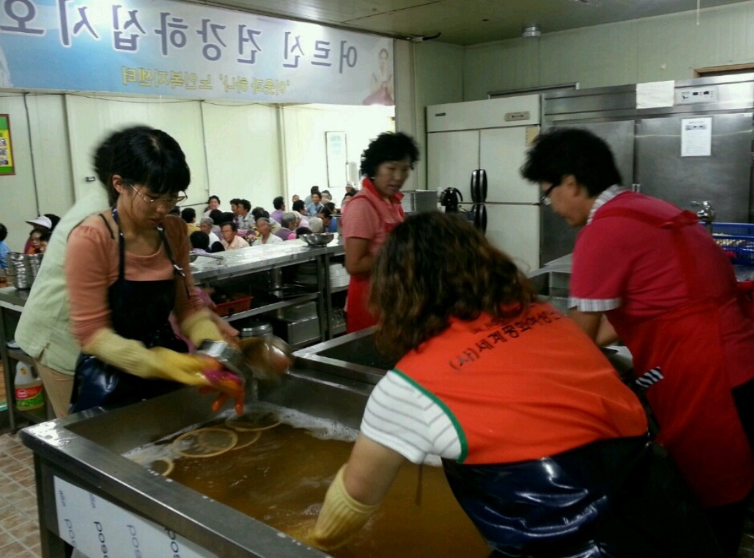 The Seongju Branch of North Gyeongsang Province (Branch Leader: Soon Rak Kim) performed a dishwashing service at the Free Meal Service Center on September 25. From 2008 up to the present, they have continued to participate in local activities by continuing to perform a dishwashing service at the Free Meal Service Center every month.