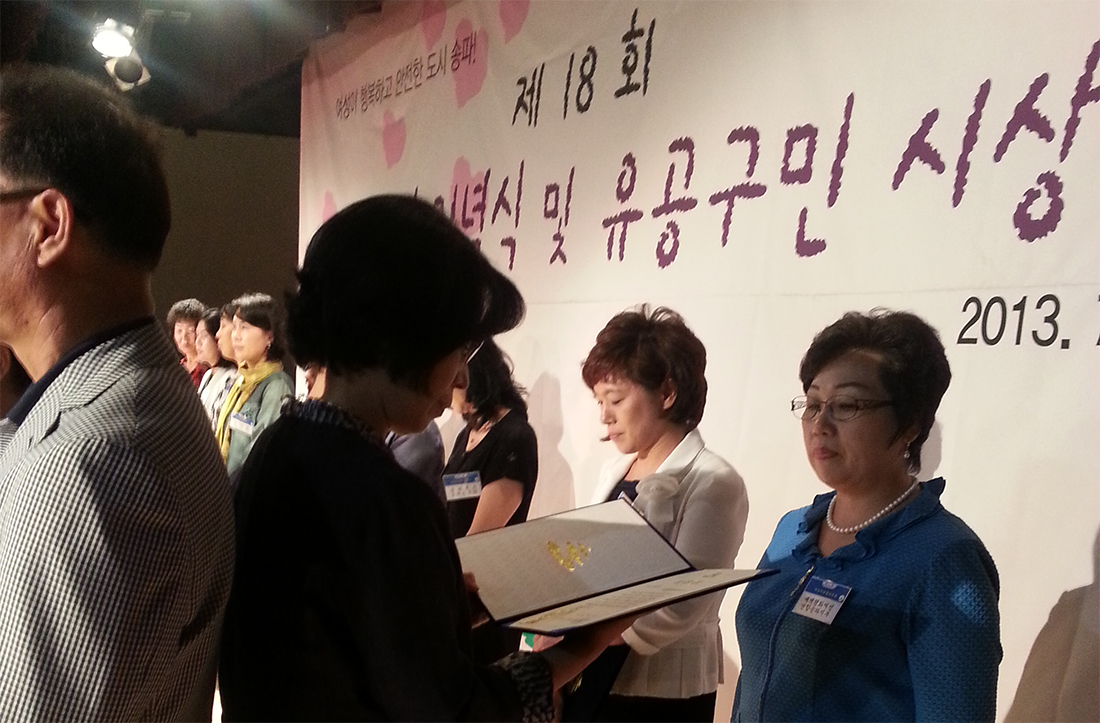 On July 5 last, Songpa Branch (Branch Leader: Myeong Ok Kim) received the Award of Commendation from the Chief of Songpa-gu at the ‘Meritorious Gu Residents Award Ceremony in Commemoration of Women’s Week’ held at the Songpa Women’s Cultural Center.The event was hosted to promote equality between men and women in its true sense and to think about the meaning of gender equality and the position of women.