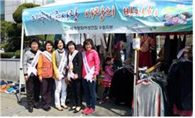 또한 4월19일~21일 수원지부는 수원시가 주최한 ‘벚꽃축제’에서 ‘지구사랑 1%운동’으로 바자회, 분식판매를 실시하였다. 지부장님을 비롯한 회원들의 열정은 뜨거웠지만 2일간은 비가 오는 추운 날씨로 판매가 좀 미비하였지만 3일째에는 날씨도 좋고 벚꽃축제 행인들도 많아서 좋은 결과를 얻을 수 있었다.