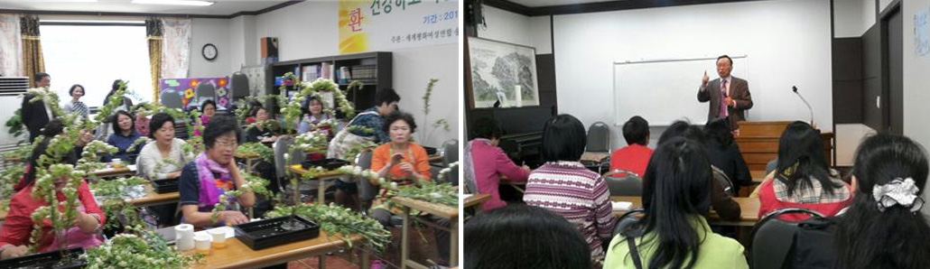 On May 1 and 8, together with Chairperson Myeong Ok Kim (Jiwon Flower Art), a theory and practice class in flower arranging was held for the enhancement of emotional development.