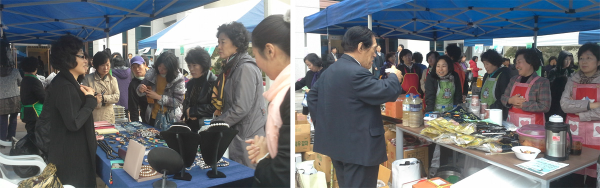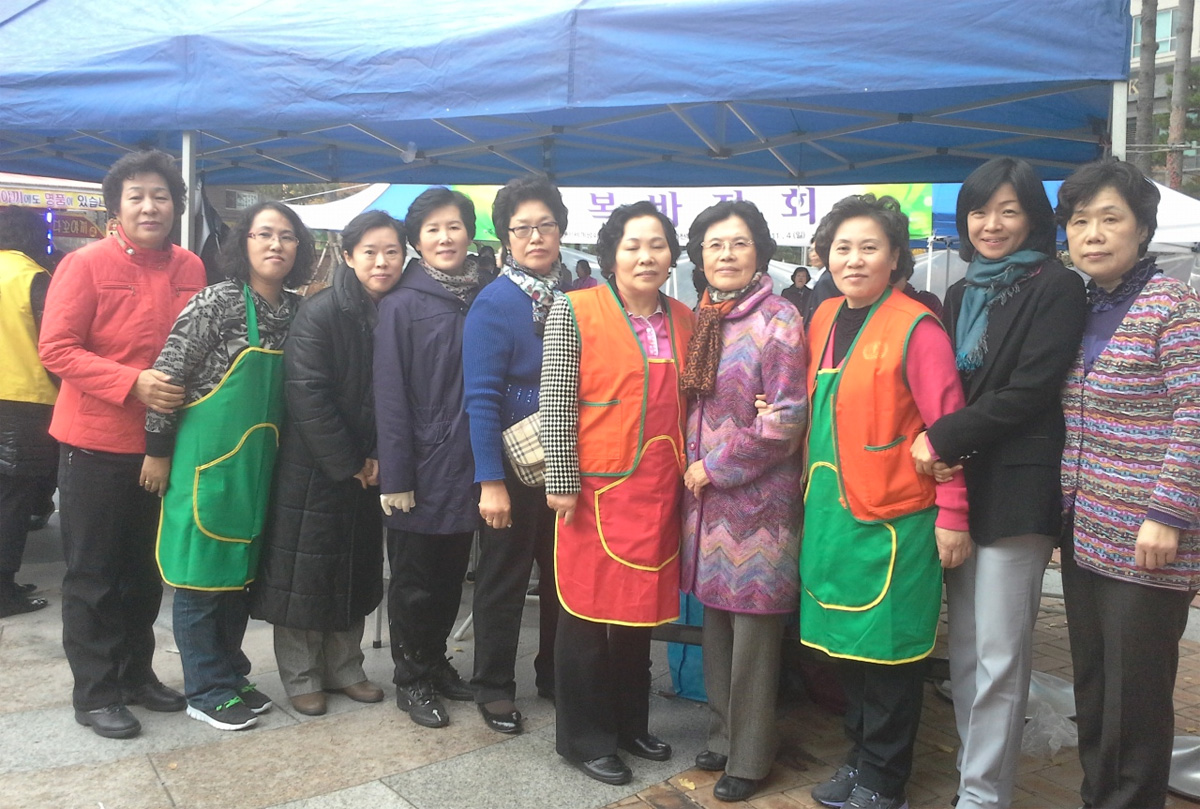 On November 4, the Cheon Bok Gung Special Branch hosted the 3rd Cheon Bok Bazaar to support the and multicultural families. It being the season for making kimchi in preparation for the winter, the bazaar sold various goods, including all kinds of salted fish and red pepper powder necessary in homes, as well as health products and used items. With Korean, Japanese and Filipino members serving the customers, the bazaar was vibrant with life and energy.