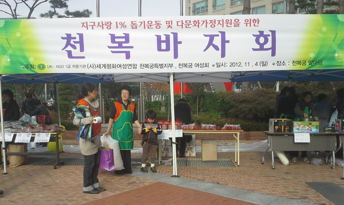 11월4일, 천복궁 특별지부는 과 다문화가정지원을 위한 제3회 천복바자회를 열었다. 김장철을 맞아 각 가정에서 필요한 젓갈류와 고춧가루, 먹거리, 건강식품,아나바다 물품까지 다양한 물품들과 한국, 일본, 필리핀 회원들의 봉사로 바자회는 내내 활기찬 분위기였다.