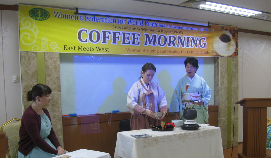 The International Women in Korea (branch manager Elizabeth Colford) held its monthly Coffee Morning on August 25 in the Unification Church Headquarters in Seoul. Mrs. Chiara Sakuwa, U.S. Marine Corps (retired) spoke about the life lessons she learned by serving in the United States Marine Corps for four years. Her presentation was titled "Serving with Pride: Reflections of a Soldier Wife and Mother".