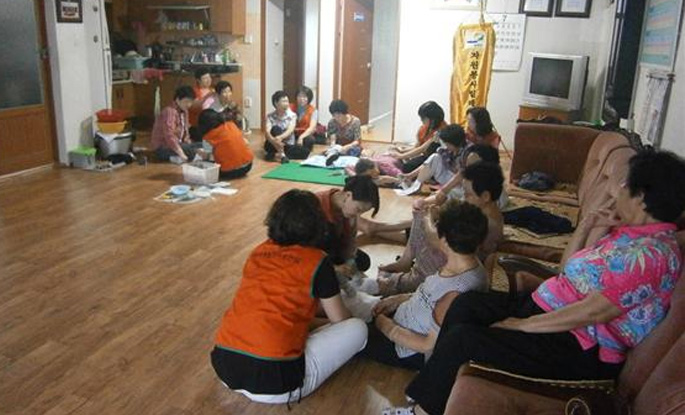 ㆍ고성지부(지부장:고이께 가즈요)는 지역 마을회관을 돌며 어르신들을 위한 쑥뜸봉사를 하고 있다.