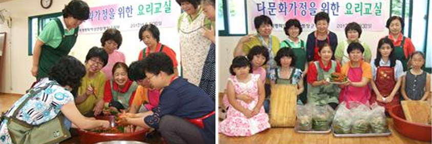The participants were taught how to make this kimchi with the explanation, “The wives of multi-cultural families should also make delicious Korean traditional dishes for their husbands in order to become beloved wives.”The cucumber chili kimchi made during the class was shared not only among the participants but also to those members who were unable to attend the class, thus practicing the Korean tradition of ‘the spirit of sharing’.