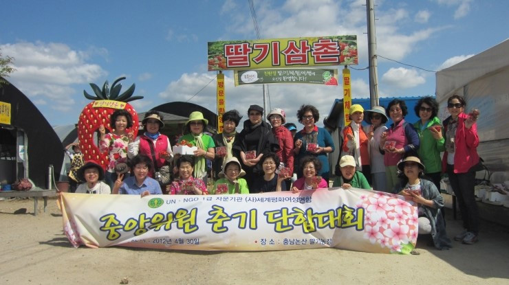 On April 30, 22 members of the Central Committee (Chairperson: Mi Hwa Park) went on a ‘strawberry picking experience’ in Nonsan, South Choongcheong Province, for their ‘spring workshop’. The Central Committee members who participated in the experience had a wonderful time, harvesting organic strawberries with their own hands (and sampling many of them!). Afterwards, they visited ‘Beartree Park’, located in Yeongi-gun, which is a tree garden with animals, and they experienced undisturbed nature as they looked around at the enormous junipers and hundreds of years old pine trees and zelkovas (Asian elm trees).