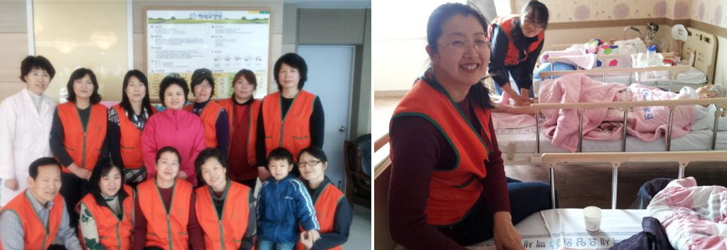 Every month, ten or so members of the Iksan Branch (Branch Leader: Myeong Sook Gang) of North Jeolla Province come together to carry out a foot-massage service for the disabled elderly in the Baek-Se Nursing Home.