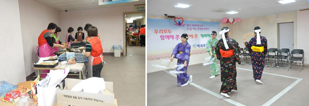 가정의 달인 5월5일에는 어버이날을 기념하여 요양원에서 효도잔치가 진행되었으며, 이날 익산지부 회원들은 ‘참사랑 봉사단’과 함께 일본 전통 무용을 선보였고 큰 박수를 받았다.