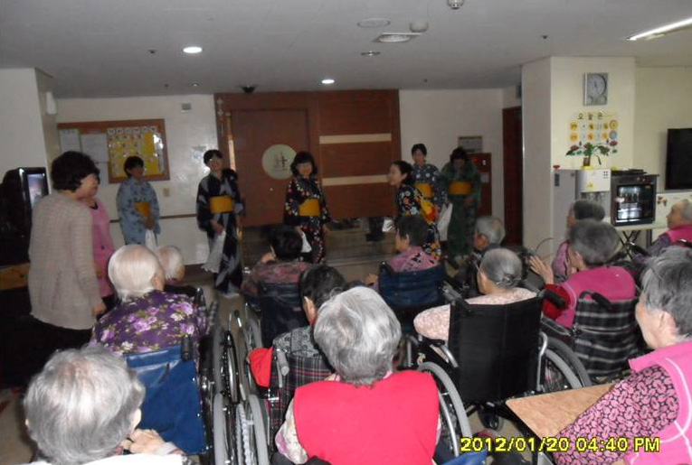 The members performed a Japanese traditional dance, a Korean traditional dance and the fan dance, and Leader Jeong Hee Gil delighted the elders with her singing.