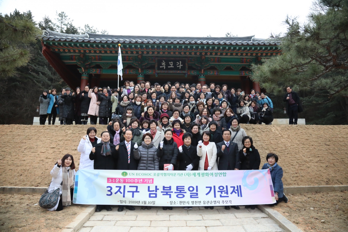 세계평화여성연합(회장 문연아)과 천안시여성단체협의회 회원들이 3·1운동 100주년을 맞아 10일 충남 천안시 병천면 유관순 열사 추모각에서 남북통일기원제를 열어 열사의 애국정신을 기리고 통일을 염원했다.