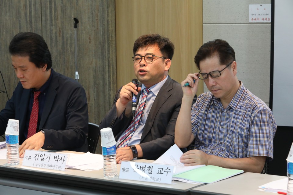 세 번째 발제는 ‘한반도 중립화와 통일방안’을 주제로 윤태룡 교수(건국대학교)는 ‘한반도 중립에 대한 논의는 1953년 6.25전쟁의 휴전 협정을 전후하여 미국행정부가 공식적으로 추진하였지만 한국정부의 강력한 반대로 실패했던 역사가 있다. 한반도 전체의 중립화가 바람직하다면 남한만의 중립화를 먼저 선도적으로 추진하는 것도 고려해 볼 필요가 있다고 발제하였다.
