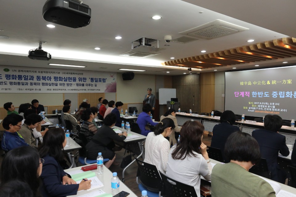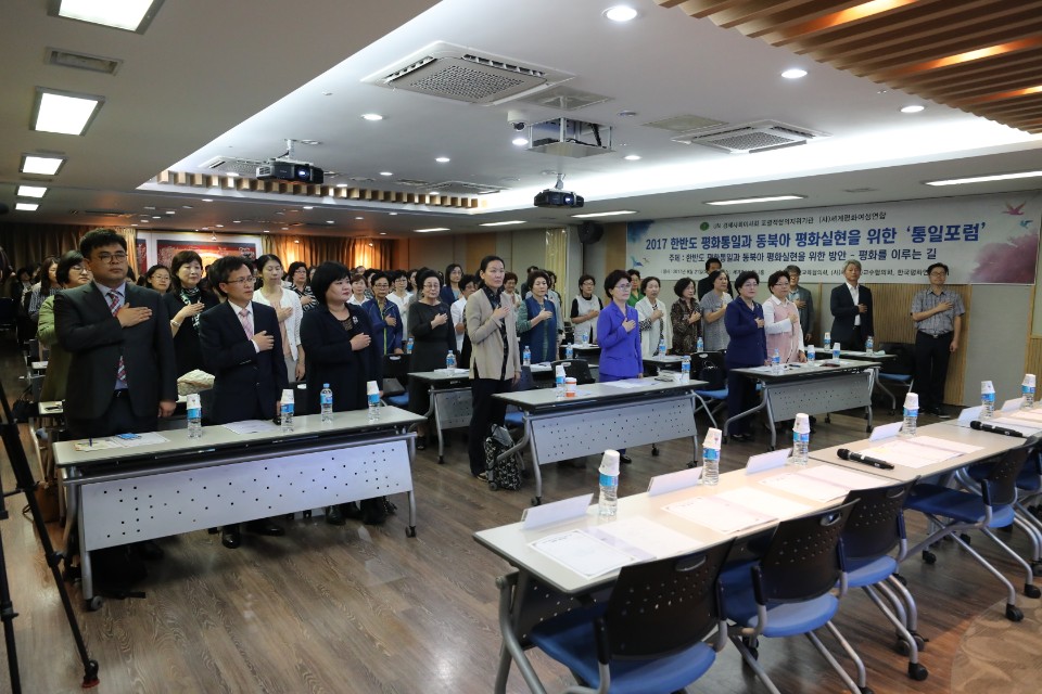 세계평화여성연합은 서울권지부(천복궁.동.서.남.북)가 연합으로 주관하고 통일교육협의회와 세계평화교수협의회 한국평화연구학회가 후원한 가운데 ‘한반도 통일과 동북아 평화실현을 위한 통일포럼‘이 ’한반도 평화정착을 위한 방안-평화를 이루는 길’이라는 주제로 9월21일(목)세계일보 유니홀에서 서울시민 및 회원 170여명이 참석한 가운데 가졌다