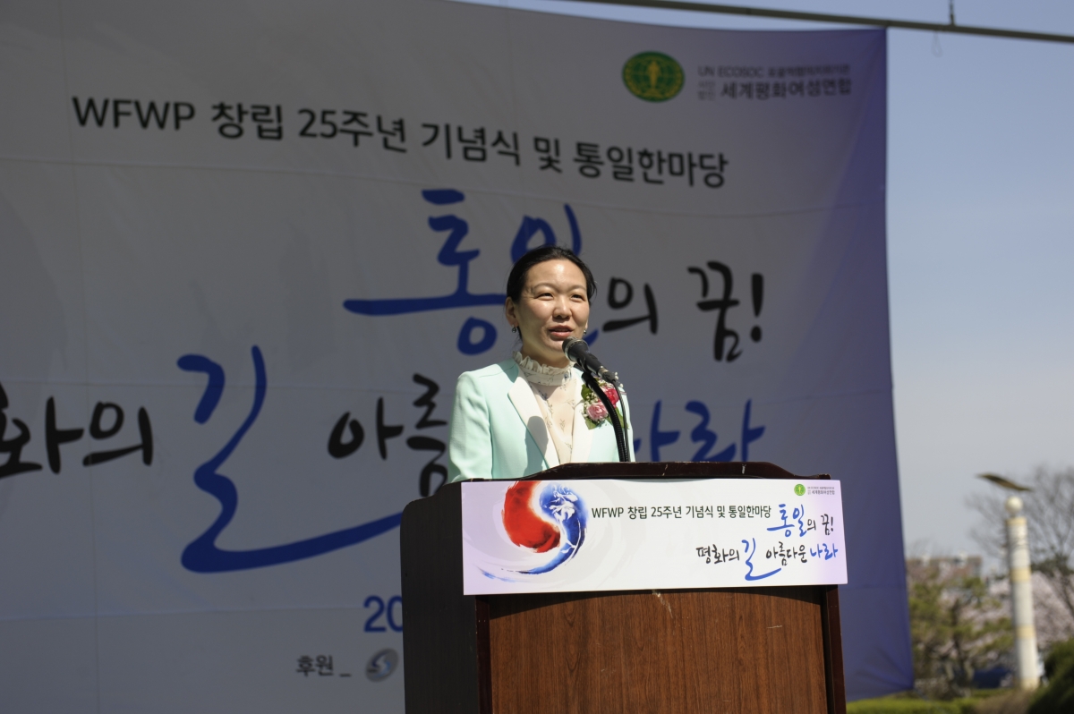최영선 여성연합 한국회장은 기념사에서 “1992년 4월10일 창설 이후 UN NGO 경제사회 이사회 포괄적 협의지위 획득과 4년마다 지위 재심사에서 5회 연속 재승인 등의 쾌거를 이루며 모성애를 바탕으로 ‘인류 한 가족 평화세계 실현’을 위해 여성평화운동의 길을 걸었다”며, “우리는 오늘 여성연합의 4반세기 역사를 한 매듭지으며, 다시 만들어 가는 25년은 우리의 미래세대를 위해 아낌없이 투입하고 또 투입하며 준비해야 하는 것이 바로 남북통일이다”라고 한반도 통일 활동을 다짐했다.