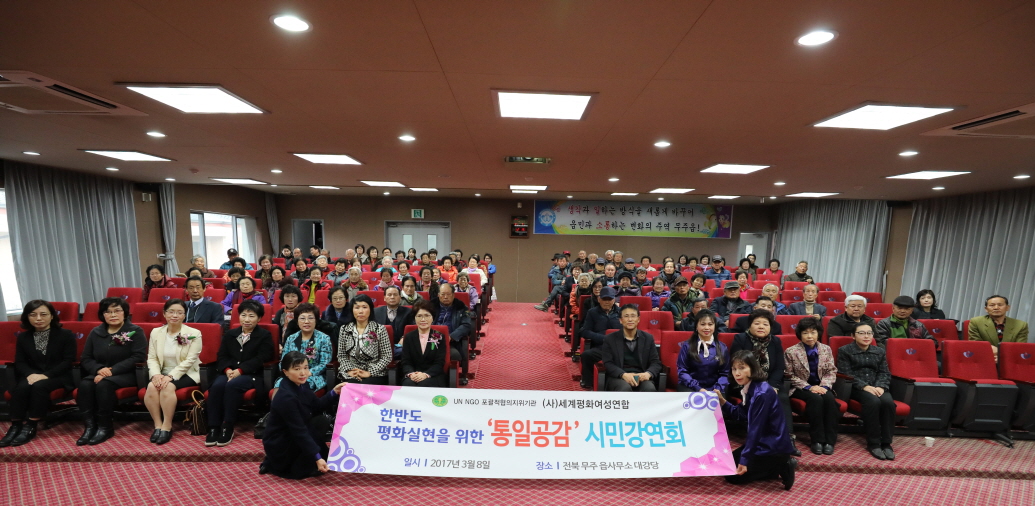 세계평화여성연합 전북 무주지부가 추최하고 세계평화통일가정연합, 무주군 UPF 무주군지부가 후원하는 「통일공감-시민강연회」가 3월 8일(수), 무주군민 및 회원 105명이 참석한 가운데 무주군 읍사무소에서 열렸다.