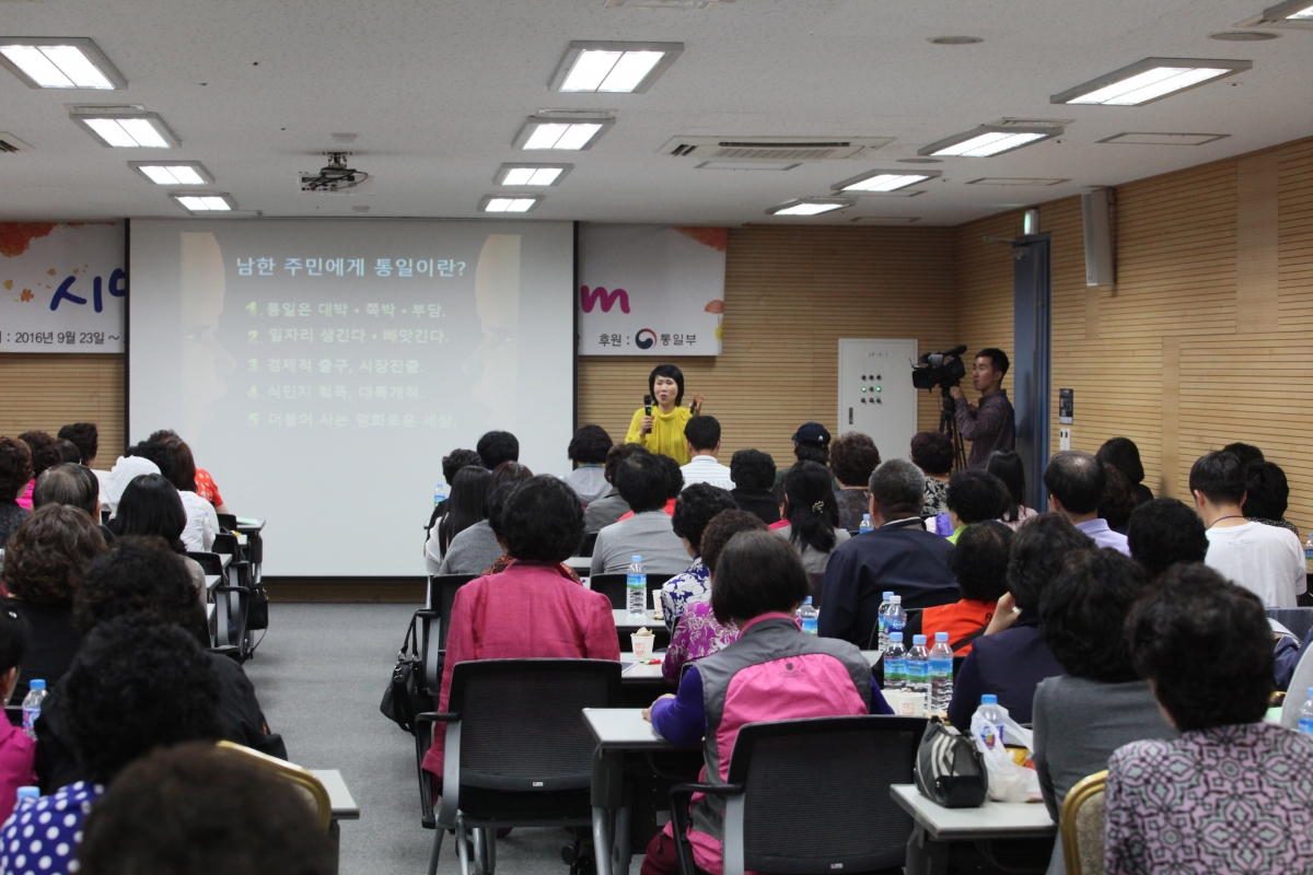 최영선 사무총장(세계평화여성연합)은 개회사를 통해 "처음으로 진행하게 된 이번 프로그램에 많은 관심을 가지고 참석해주신 모든 분들께 감사드린다. 지금 이 세상을 바라보면 통일이 과연 가능할지 의심과 걱정이 되지만, 분단이 갑자기 된 것처럼 통일도 언제 될지 모른다. 그렇기에 통일을 미리 준비해야 한다.“며 지역 시민들이 통일운동에 관심을 가져주기를 강조했다.