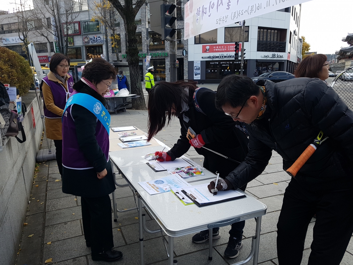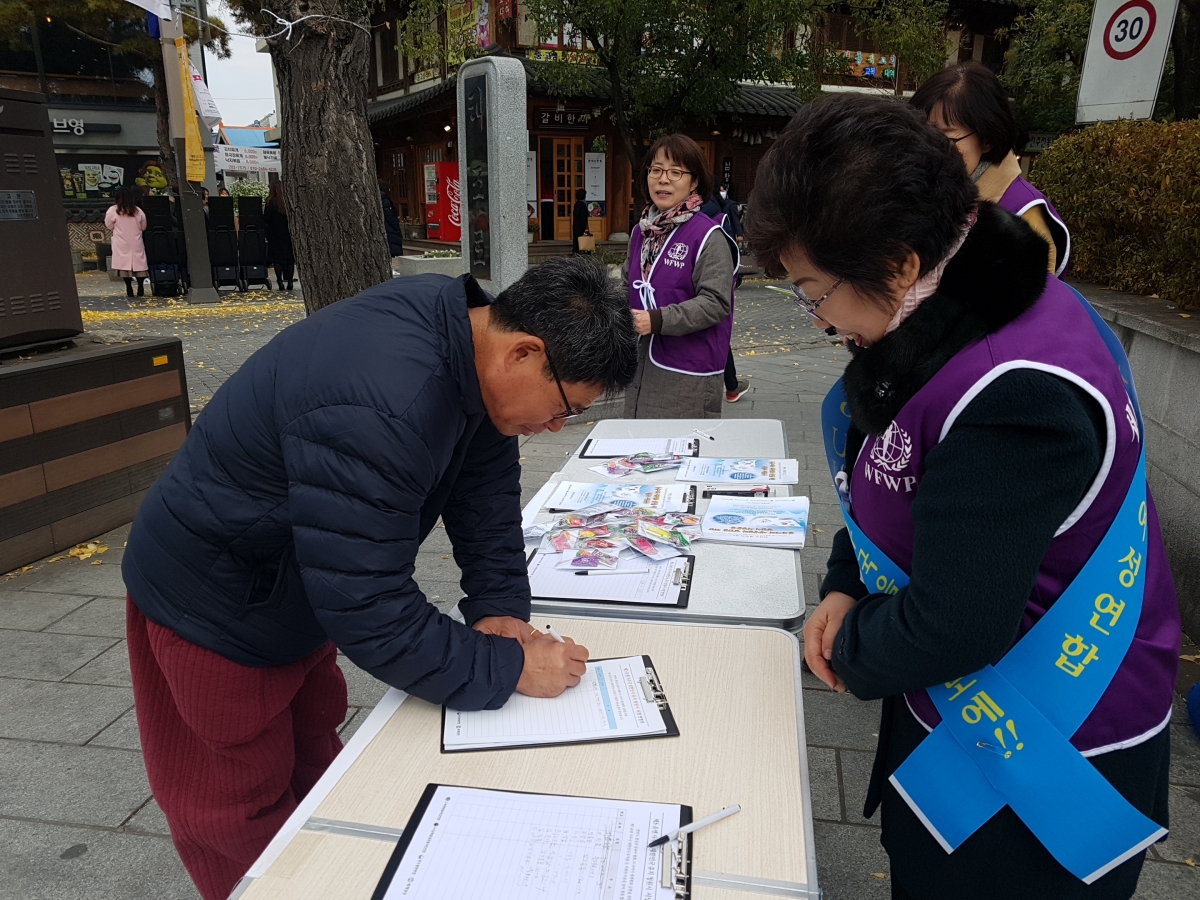 세계평화여성연합 전북지부는 2017년 11월19일 전주한옥마을에서 제5UN사무국 한반도유치 서명활동을 실시하였다. 김명옥도지부장을 중심으로 이남희전주지부장과 회원들, 전북성화학생회장단(울산학생10명)60여명과 함께 작년(16.11.05~06)에 이어 두 번째 실시하는 교육 및 서명활동이다.