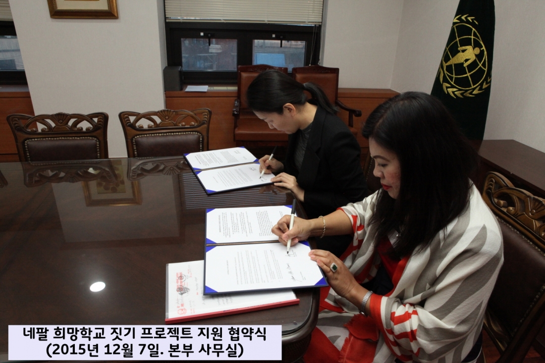금번 2차로 Shree Jageshwor Higher Secondary School을 ‘네팔 희망학교 짓기 프로젝트’로 선정하여 12월7일 문연아 세계회장과 블레씨 다칼 네팔 여성연합 회장은 본부 직원들이 함께한 가운데 본부 사무실에서 ‘네팔 희망학교 짓기 프로젝트 지원 협약식’을 가졌으며,