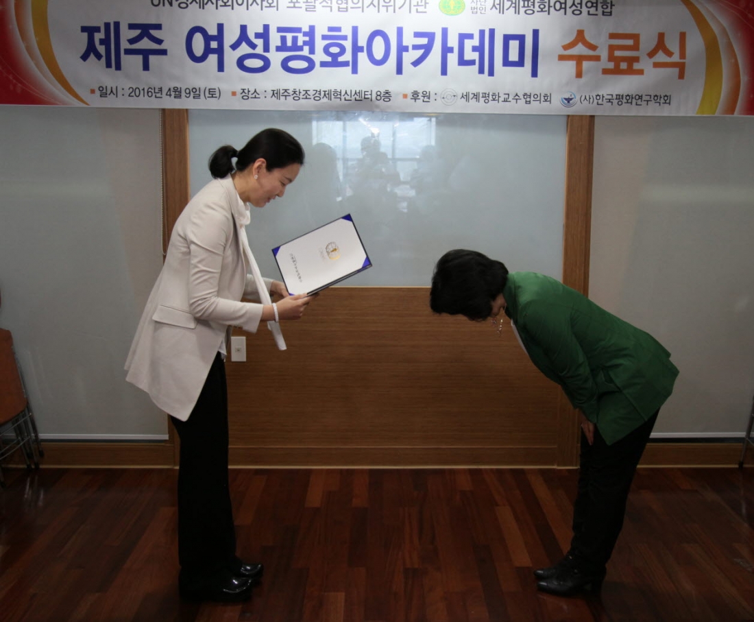 세계평화여성연합(회장 문연아)는 4월 9일 제주창조경제혁신센터에서 6주간의 제주여성평화아카데미를 마무리하며 수료식을 가졌다.