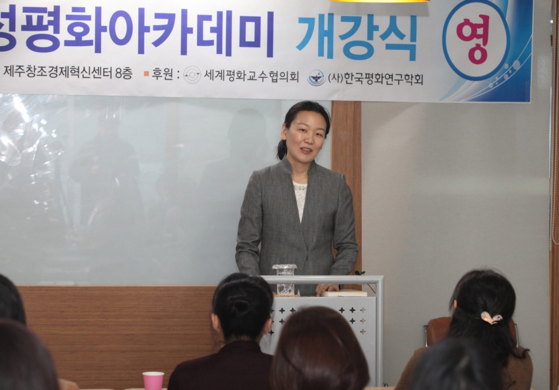 축사에 나선 고경민 세계평화교수협의회 제주도 지회장(제주대 교수)은 “제주도는 역사적으로 많은 갈등과 그로 인한 아픔을 간직한 섬이었지만 지금은 갈등해결의 노력을 통해 평화의 섬으로 거듭나고 있다. 그런 제주도에서 다문화가정 여성들을 대상으로 여성, 통일, 평화에 대해 배우고 고민할 수 있는 자리가 마련되어 굉장히 기쁘다.”며 축하의 인사를 전했다.