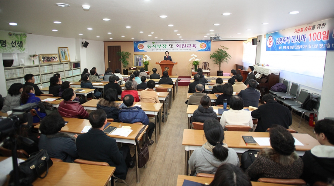 It was opened by the MC, Church Leader In Gi Yeon, and the welcoming address was given by Branch Leader Han Sook Jeong (Gwacheon), followed by an activities report by Secretary-General Yeong Seon Choi (Headquarters), the presentation of the certificate of appointment to the Dong branch leader, and a speech delivered by President Lan Young Moon.