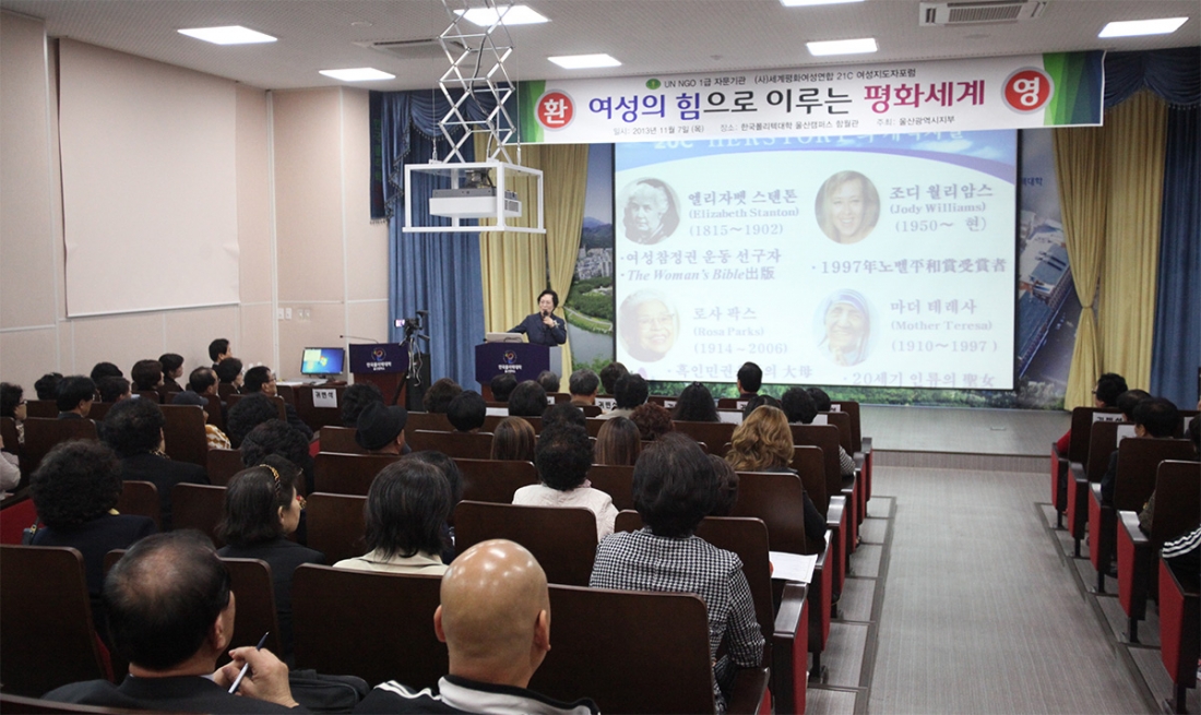 울산지부(지부장:김자윤)는 지난 11월 7일 울산폴리텍대학 대강당에서 울산 지역주민 190명이 참석한 가운데 ‘여성의 힘으로 이루는 평화세계’를 주제로 ‘21C 여성지도자포럼’을 개최했다.