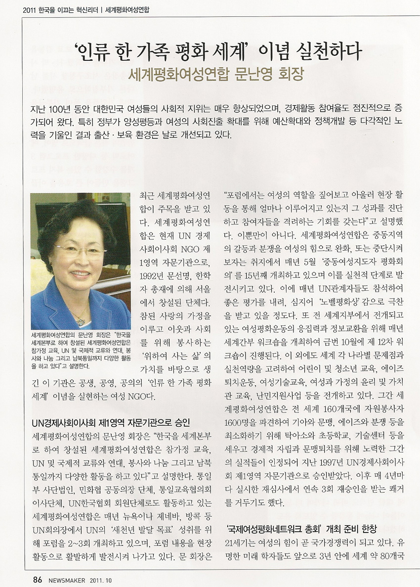 On 23 August, Sisa Magazine reported WFWP’s activity with the title "Women’s Federation for World Peace, a core leader leading Korea 2011." Sports Chosun dated 21 September introduced our activities as the "True guardian of peace, first-class NGO approved by the UN," and the News Maker magazine in the issue dated 25 September introduced WFWP as an active organization under the title, "Women NGO Headquartered in Korea – Women’s Federation for World Peace."