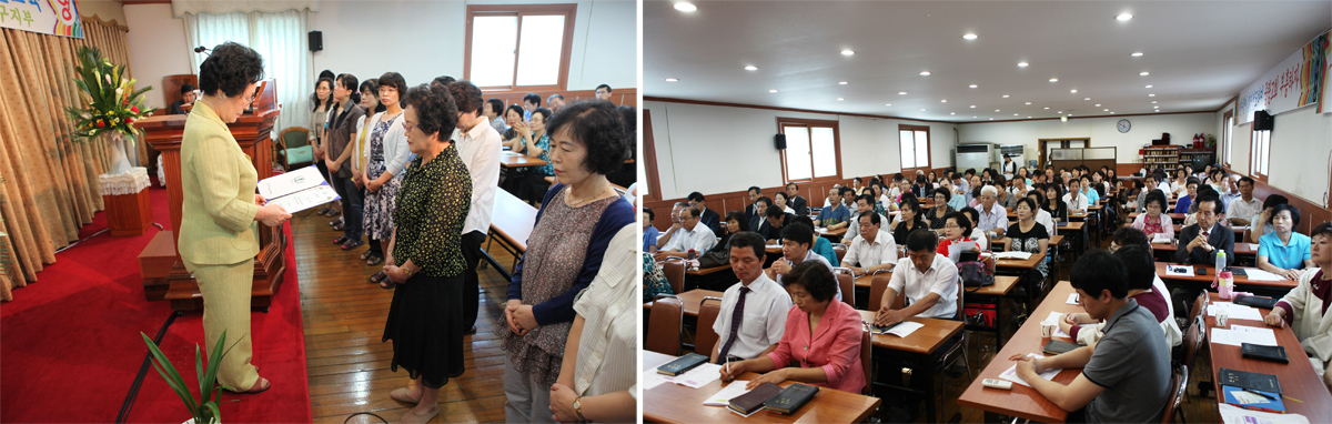 Participating were 150 people. Dong Branch Manager Son Myung-soon was MC. Followed by Branch Manager Ha Gye-soon's welcoming remarks, Kang Tae-moon, the Jungnang Church leader, gave words of encouragement, and Secretary General Choi Young-sun reported on activities. President Moon gave the main lecture and conferred a certificate of appointment to the new vice branch manager of Jungnang Branch and the dong branch manager.