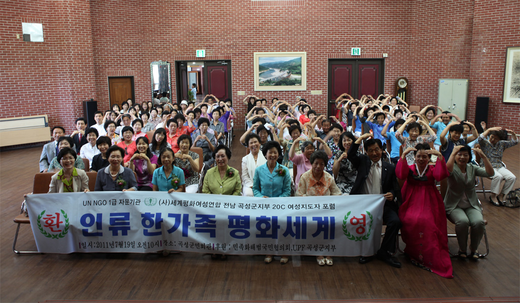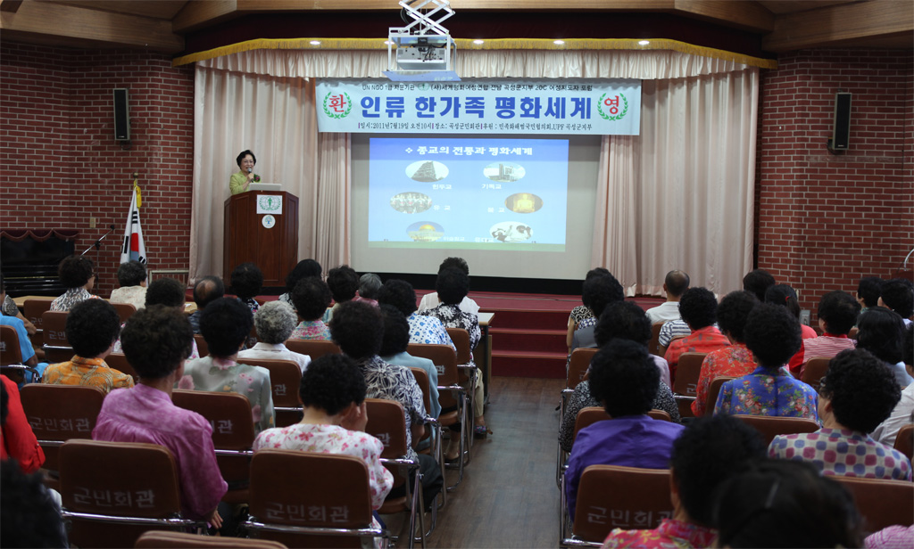 The forum started with MC Yang Hee-sook's greetings. The program included a welcome speech by the Gokseong branch manager, congratulatory messages from Heo Nam-seok subprefect and Lee Sang-cheol, mayor of Gokseong County, words of encouragement from the governor of Jeonnam Province Son Sook-hee, and president Moon Lan Young's main talk under the title of "Humankind, One Family in a Peace World."