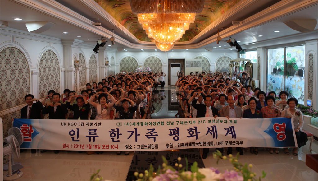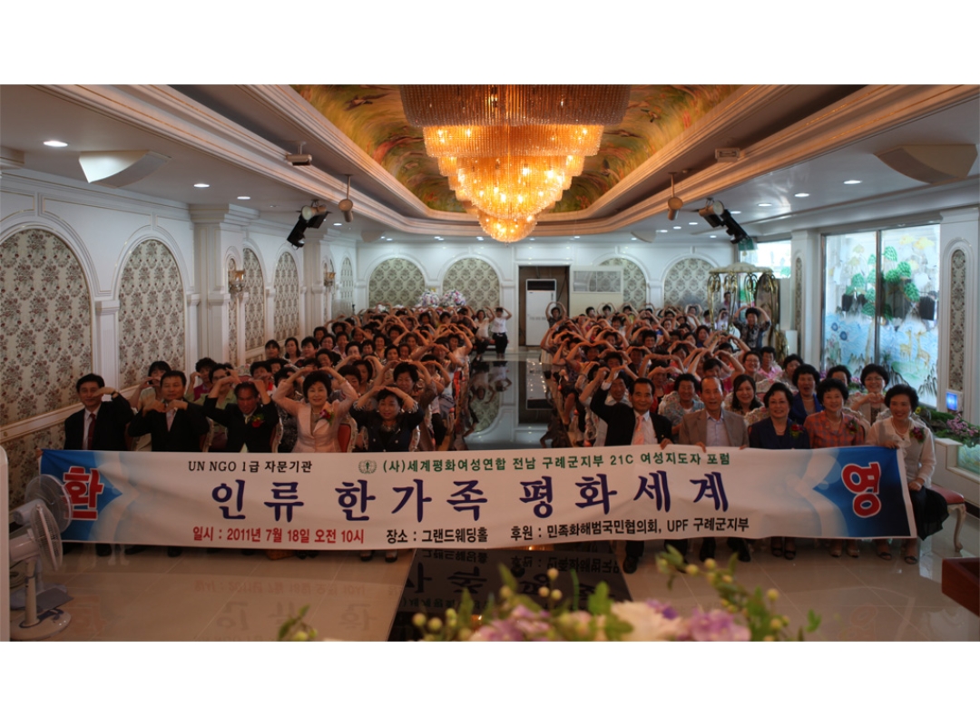 구례군 지역의 지도자들과 지역주민 168명이 참석한 포럼은 요시다 미사꼬 회원의 사회로 참사랑합창단의 축송, 김현순 지부장(구례군)의 환영사, 서은식 군의장의 축사, 손숙희 도 지부장(전남)의 격려사, 문난영 세계회장(본 연합)의 주제 강연 순으로 진행되었다.