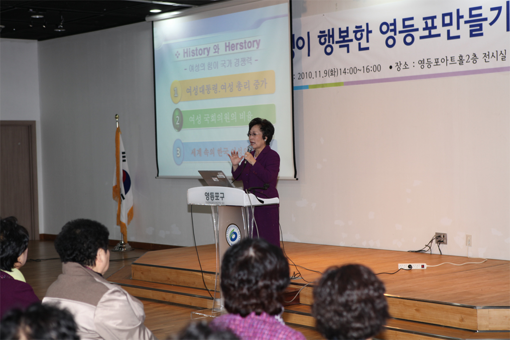 Last Nov. 9, the Yeongdeungpo Women’s Organization (Pres. Oh Sun-ae) hosted a lecture by Pres. Lan Young Moon (WFWP HQ) on "Building a Peaceful World with the Strength of Women" as part of the Women's Happiness Project, with 400 women at the Yeongdeungpo-gu Hall. This was part of "The Second Women's Happiness Policy Forum" to promote a successful 'Women's Happiness Project' aimed at making Yeongdeungpo-gu a happy place for its women residents.