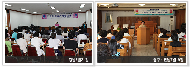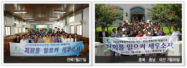 From July 19, WFWP Korea started a "Special Training Program" of 3,400 dong branch managers and board members nationwide. The 1st training was held at Gwanju and Jeollanam-do on July 19, Gyeongsangnam-do on July 21, Ulsan on July 22, Incheon on July 23, Chungcheongnam Chungcheongbuk Daejeon on July 26, Jeonbuk on July 27 and Gangwon on July 29. The 2nd training is scheduled at the end of August starting in the Seoul area.