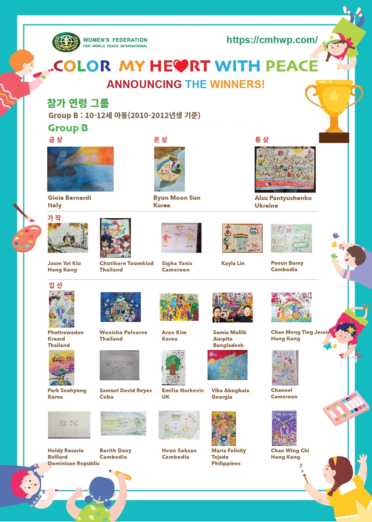 세계평화여성연합 인터내셔널에서 주최하는 2022년도 Color My Heart with Peace 아동미술대회에 많은 관심과 참여를 해 주셔서 감사드립니다. 이번 대회 수상자를 안내해 드립니다. 한국에서는 총 4명의 어린이가 수상하였습니다, 진심으로 축하합니다! 자세한 사항은 Color My Heart with Peace 홈페이지 또는 페이스북을 통해 확인하실 수 있습니다.