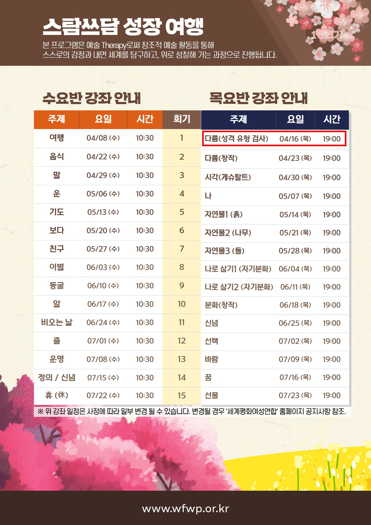 "스탐 쓰담 성장 여행"이 오는 4월 8일부터 매주 수요일과 목요일 총 15회기 동안 진행될 예정입니다.