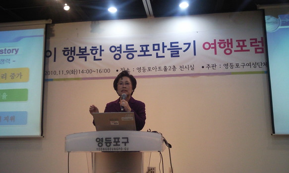영등포 여성단체협의회(회장 오선애) 주최 '여성이 행복한 영등포만들기 여행포럼 교육'이 지난 11월 9일 영등포아트홀에서 400여 여성단체 회원들이 참여한 가운데 문난영 세계평화여성연합한국회장의 초청특강으로 성료되었습니다.