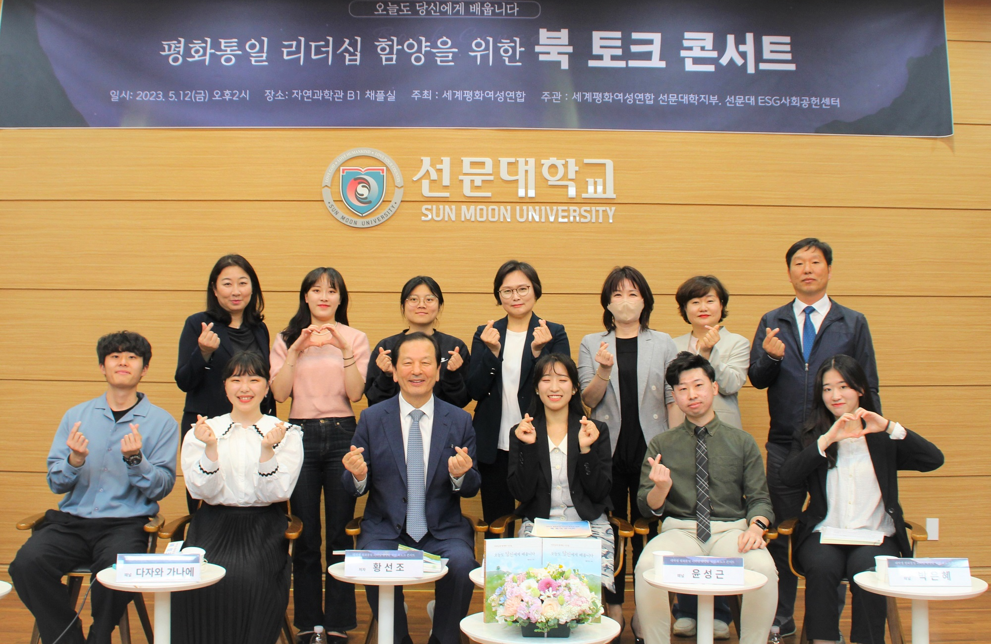 여성연합 선문대학지부와 선문대학교 ESG사회공헌센터는 지난 5월 12일 도서 『오늘도 당신에게 배웁니다』를 중심으로 '청년학생의 평화통일 리더십 함양을 위한 북 토크 콘서트'를 개최했습니다. 현장과 온라인에서 중계되며 진행된 이날 행사에는 100여 명의 학생과 교직원들이 참가하여 평화의식을 제고하는 시간을 가졌습니다. |