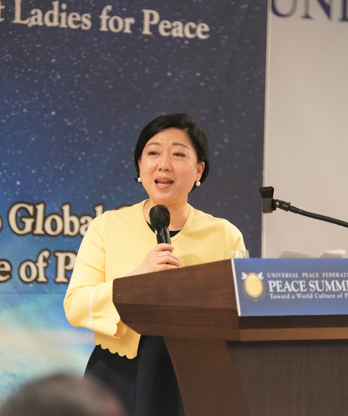 5월 3일, 잠실 롯데호텔 월드 루비&제이드홀에서 전·현직 영부인 및 여성지도자 80여 명이 모인 가운데, '세계평화영부인연합 세션'을 개최했습니다. '세계 질서에 대한 현대의 도전과제: 평화를 기반으로 한 세계 문화를 향하여'를 주제로 진행된 이날의 세션에서 영부인들과 여성 지도자들은 열렬히 세계평화를 위한 스피치를 전했습니다. 개회사를 전하는 호리 모리꼬 세계회장 |
