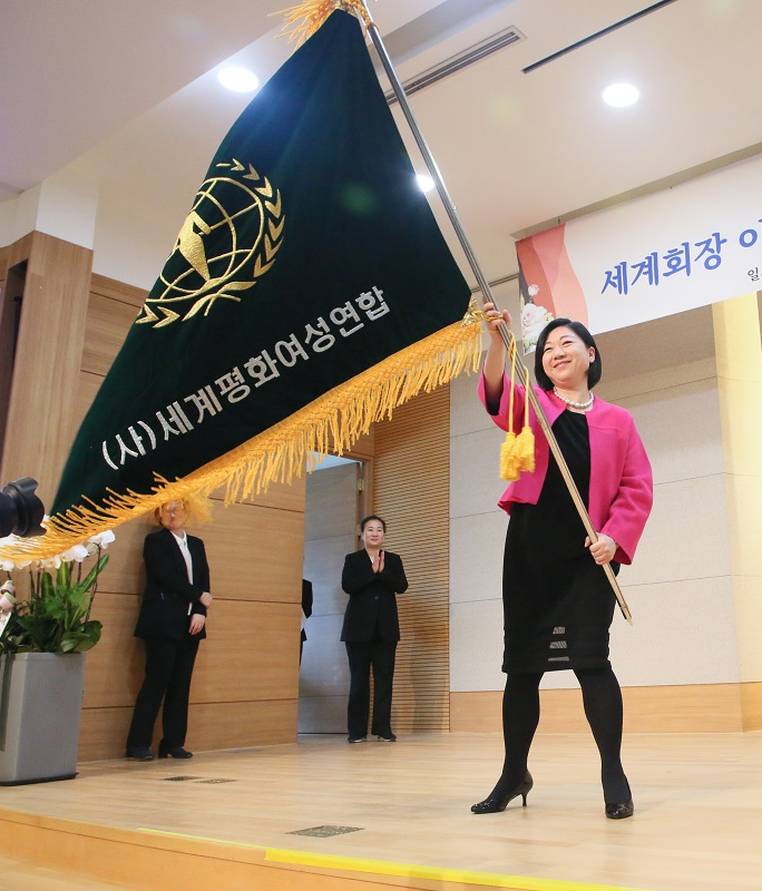 3월 14일, 청파동 8층 대강당에 본부 임원과 회원 270명이 모인 가운데, '세계회장 이·취임식 및 정년퇴임 공로패 수여식'을 가졌습니다. 호리 모리꼬 세계회장은 세계 평화를 이루는데 중요한 어머니의 사랑과 여성연합의 역할에 대해 언급하며, 신임 세계회장으로서의 포부와 결의를 담은 취임사를 전했습니다. 연합기를 이양 받은 제5대 호리 모리꼬 세계회장 |